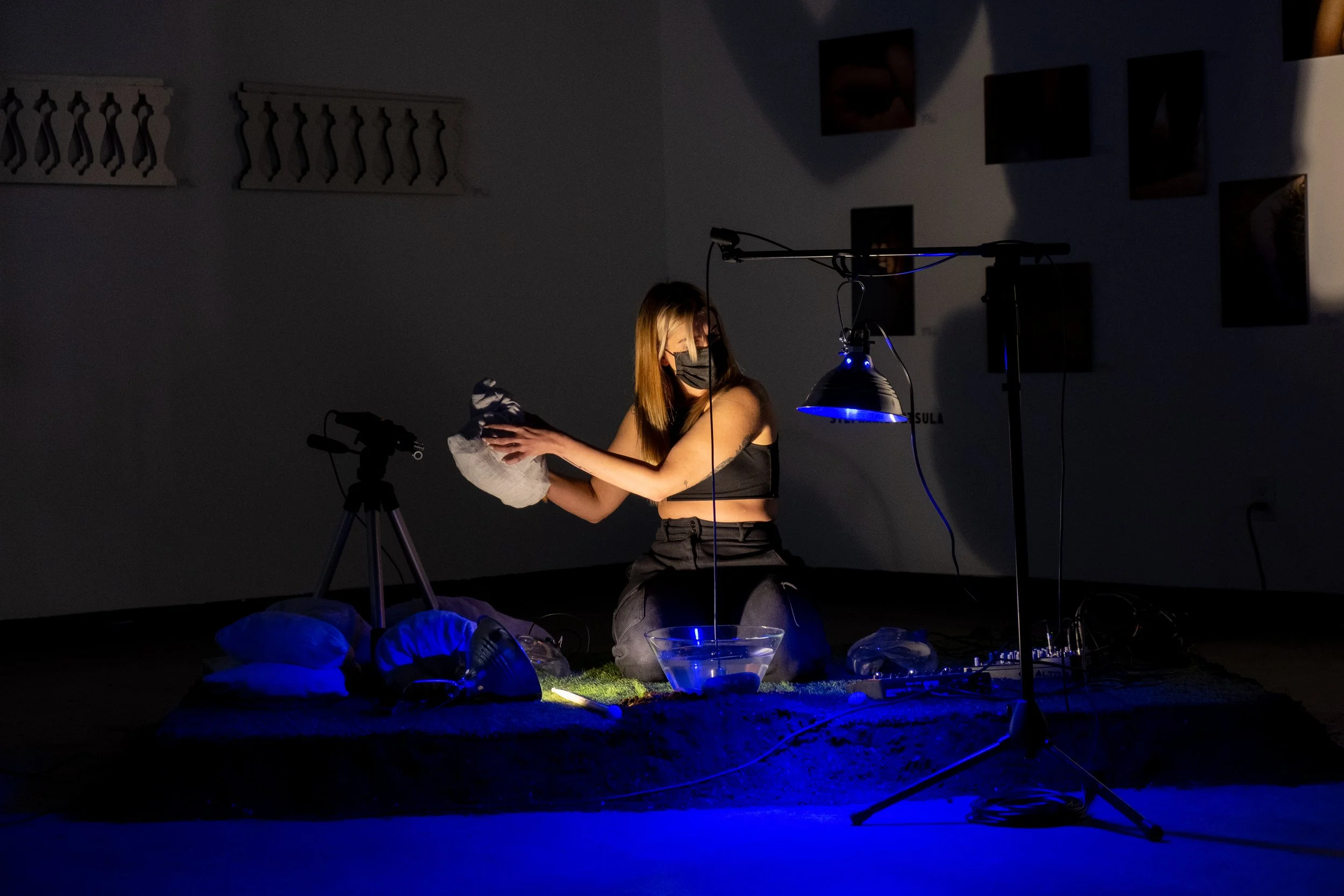 Stephanie Patsula will perform Sympathetic Resonance, an embodied sound and movement assemblage. With the use of water filled glass instruments amplified by a hydrophone, and two contact microphones, Patsula uses the resonance of the room to create an immersive sound bath. The harmonic phenomenon of sympathetic vibration is achieved when a passive body responds to external vibrations in a similar harmonic range. By creating a live feedback loop with her body, instruments and the acoustics of the room, she creates improvisational soundscapes with the intention for vibrational reciprocity with the individuals, objects and architecture of the spaces she performs. The process of responding to sensations in her body to create an experience for others, opens up channels of emotional empathy and Patsula attempts to playfully engage with proximity to the audience.