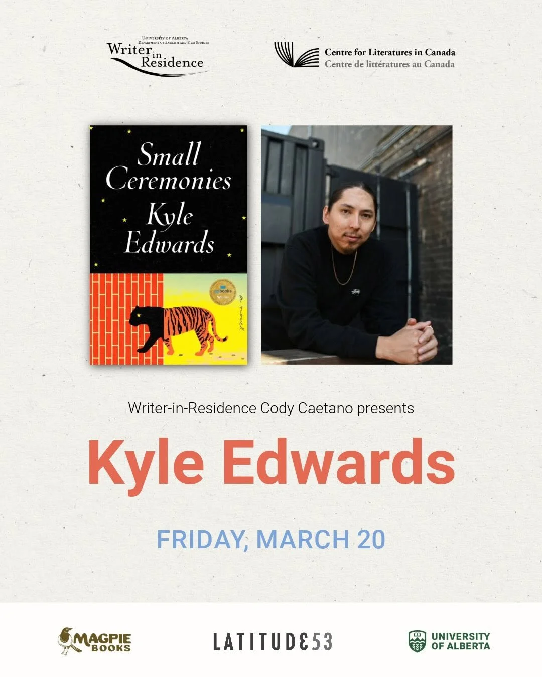 Join Kyle Edwards on the evening of March 20 at Latitude 53. Kyle will read from his novel Small Ceremonies, followed by a discussion with Writer-in-Residence Cody Caetano. Kyle's book will be available for purchase, courtesy of Magpie Books.