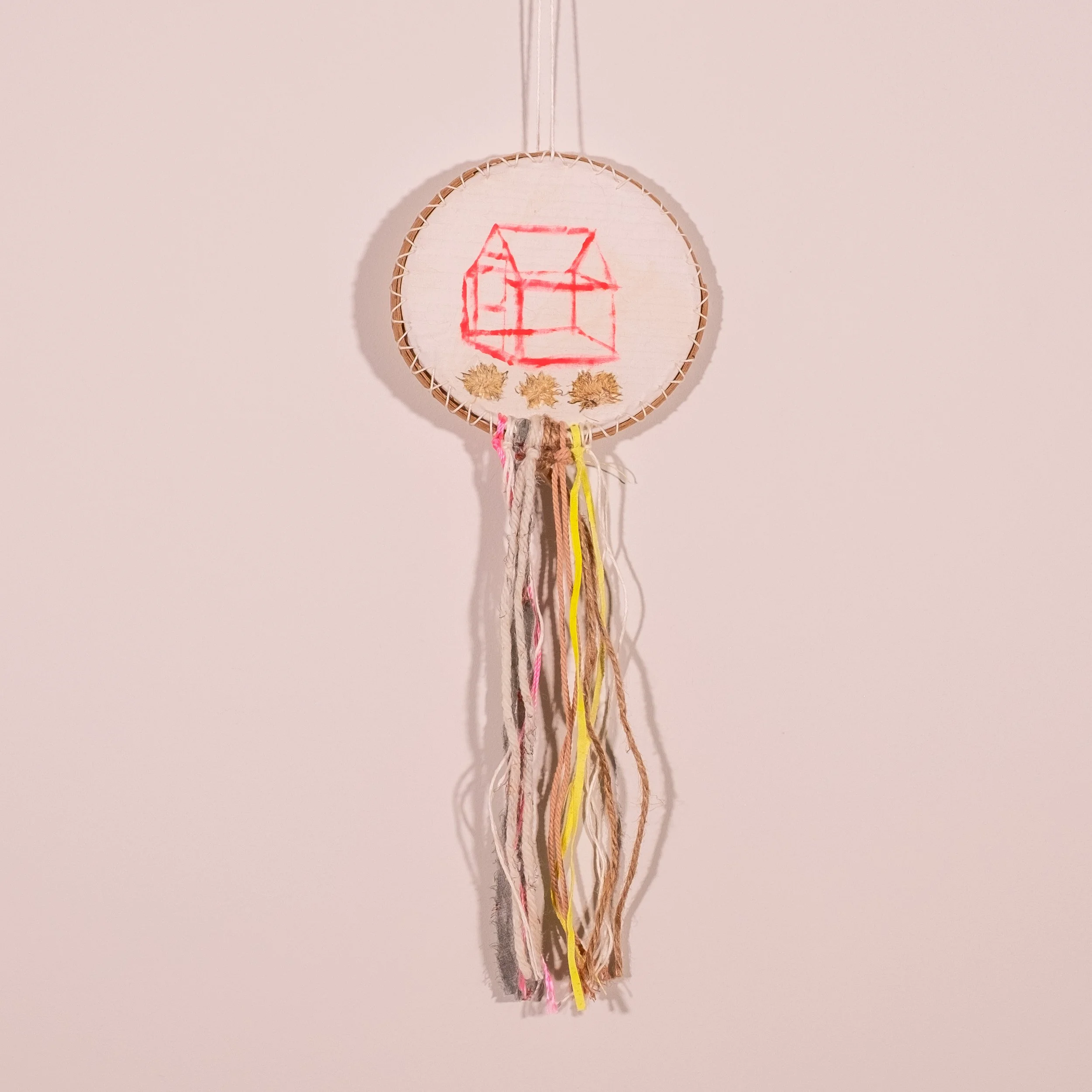 Colonial Structures, Upcycled cotton, latex paint, fabric and cordage from the Bemis Center thrift shop, dried dandelions from the Okada Garden, Bemis Center for Contemporary Arts, 12 × 6 inches, 2024