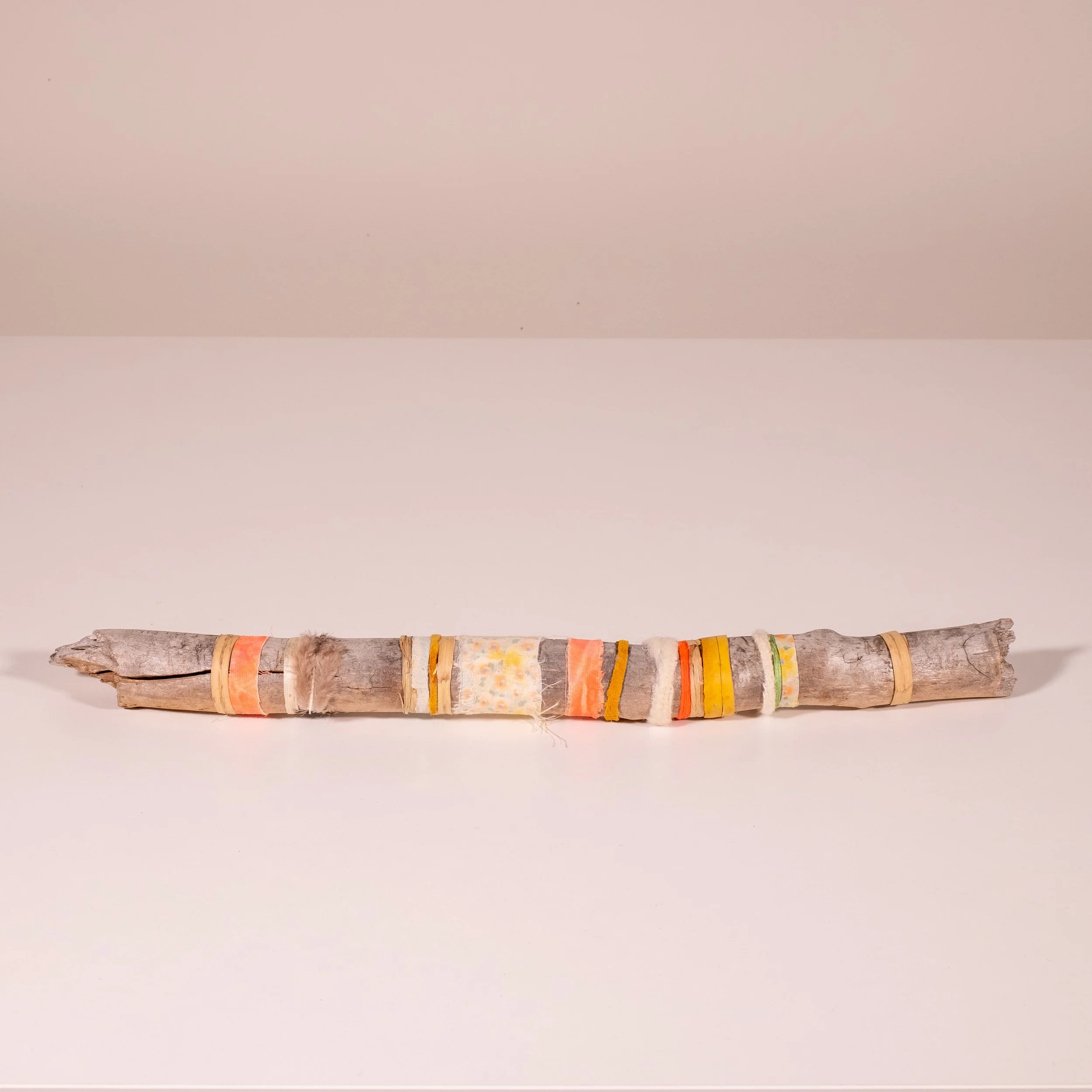 Adorned Branch, Fabric, hide, flagging tape and thread remnants, feathers, sweetgrass, and lace on found branch, 13 × 2 inches, 2023